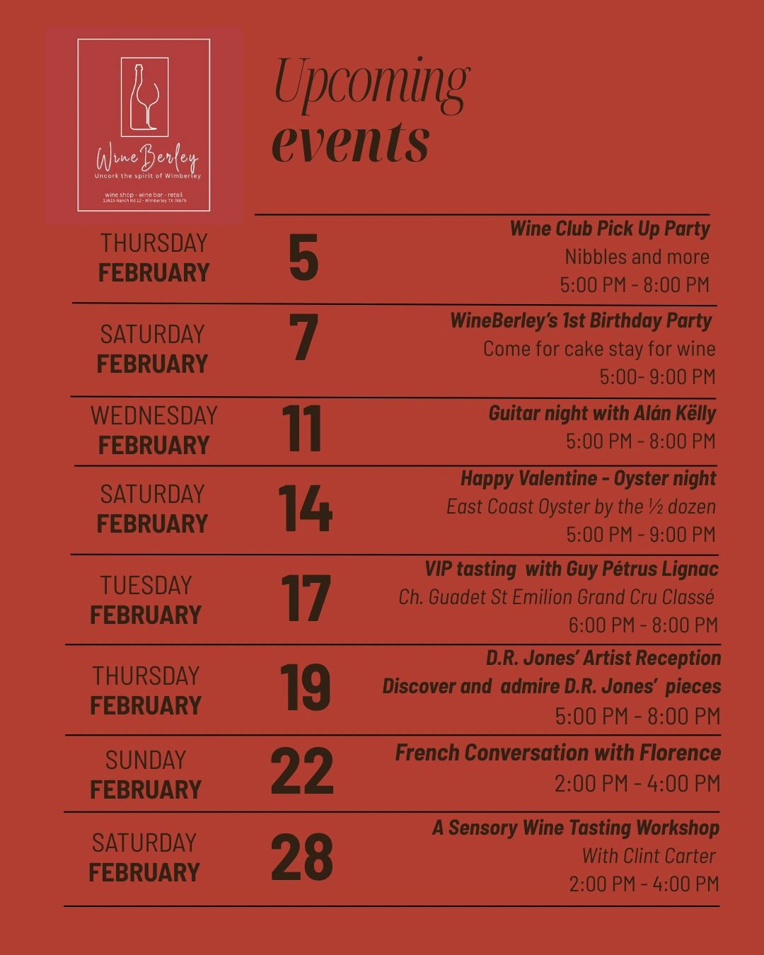 Join Florence Lemoine, French professor at Texas State University and wine lover, for a relaxed French conversation class. Sip wine, practice your French, and enjoy an informal, welcoming atmosphere—no pressure, just plaisir.
